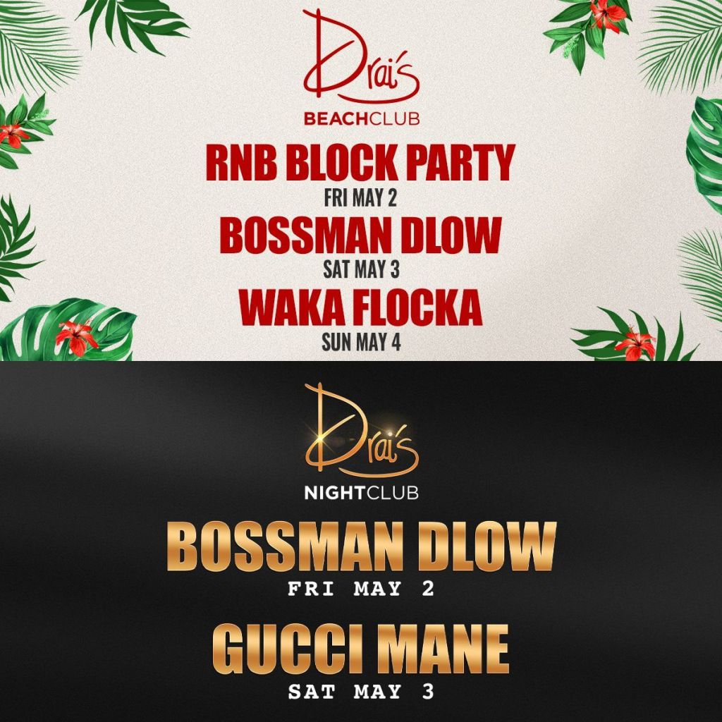 May line up for Drai’s Beach club including Wiz Khalifa, Jacquees, Patrick Cornett, and more. Free Guest List text 702-929-4946