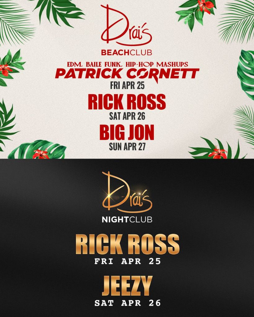 Drai’s got the party you wanna go-to with a mashup with Patrick Cornett in the day and Rick Ross at night on the rooftop. Free Guest List text 702-929-4946