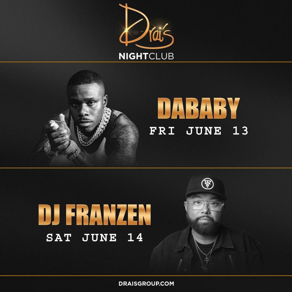 Drai’s Nightclub this weekend with DaBaby on Friday and DJ Franzen on Saturday. For Free entry Guest List text 702-929-4946