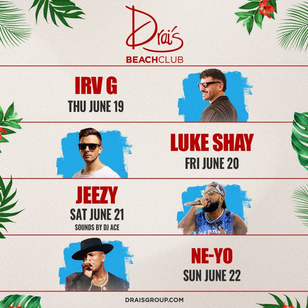 Free entry all weekend at Drai’s Beach with Irv G, Luke Shay, Jeezy, and Ne-Yo live in Vegas. For Free Guest List text 702-929-4946