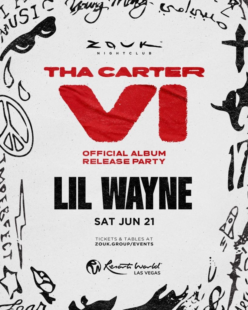 It’s about that time. #LilWayne #ThaCarterVI Official Album Release Party here in Vegas at Zouk Nightclub tonight. Ladies are FREE guys reduced (better than full price) on Guest List text 702-929-4946