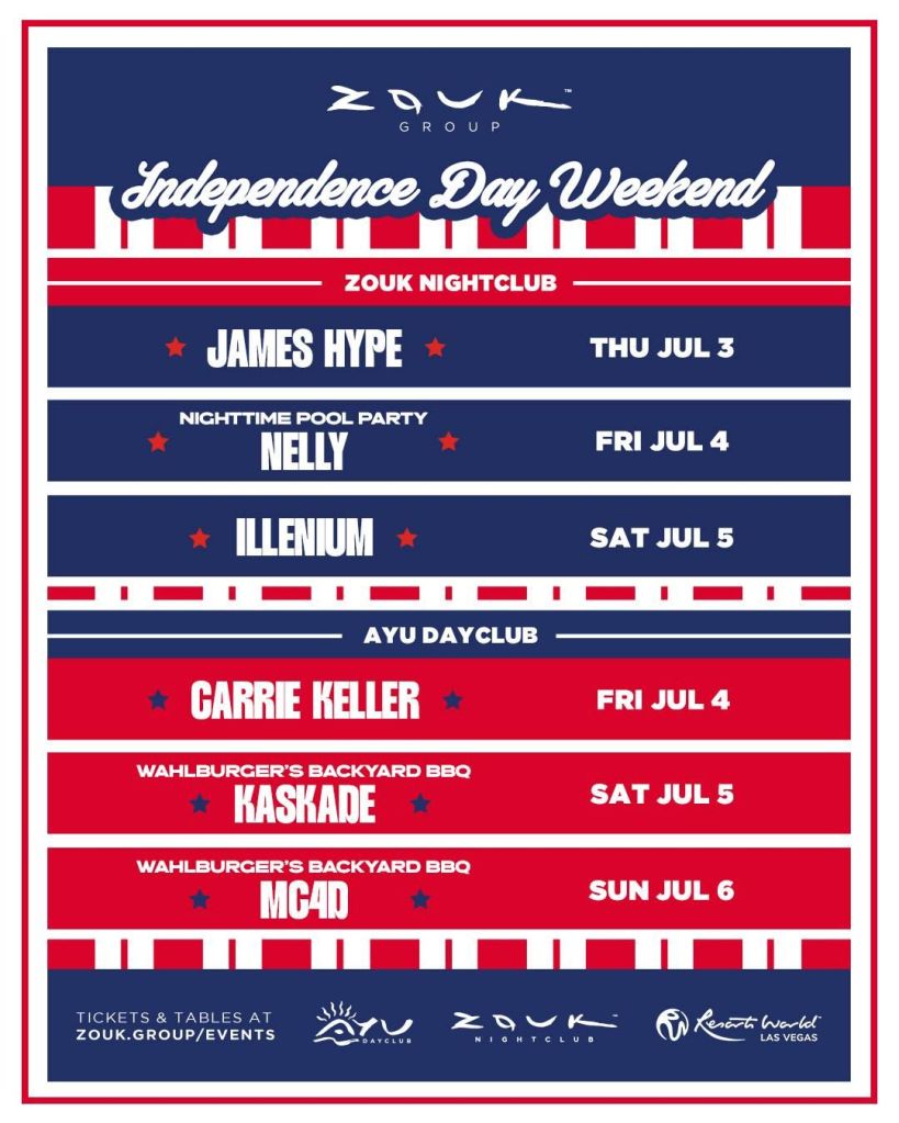 4th of July weekend is here with Nelly live performance at Zouk night swim. Backyard BBQ at Ayu Dayclub with Kaskade and MC4D and more coming. All weekend Free entry Guest List text 702-929-4946