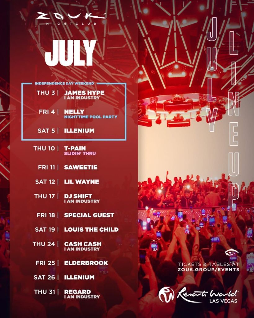 Line up for Zouk Nightclub this month of July with #TPain, #LilWayne #CashCash #Saweetie and more. Free entry guest list simply text 702-929-4946