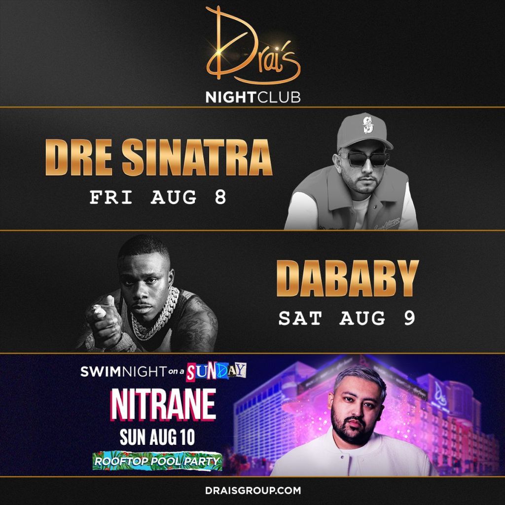 Swim Night on Sunday, DaBaby on Saturday and tomorrow with Dre Sinatra at Drai’s Nightclub this weekend. For FREE ENTRY on guest list text 702-929-4946