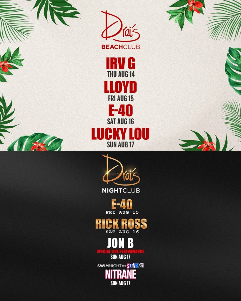 Free entry Oh my it’s E-40, Rick Ross and much more coming to Drai’s Nightclub and Beach this weekend. Free Guest List text 702-929-4946