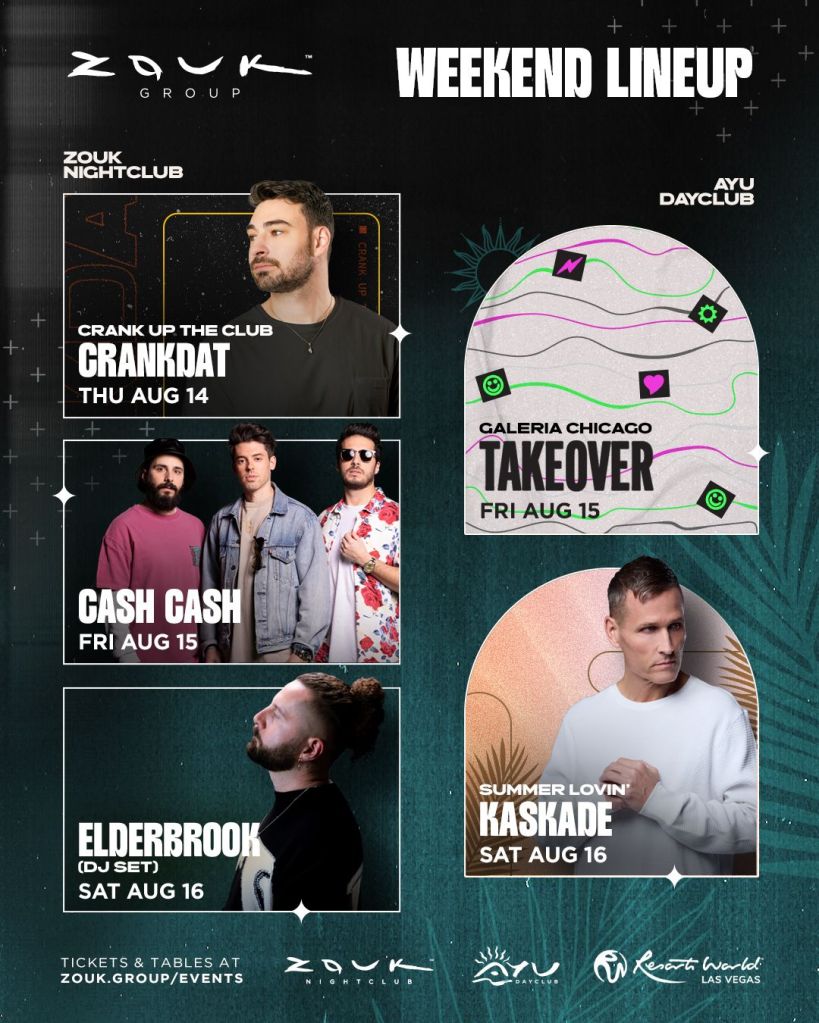 Free entry. We cranked up the weekend with Kaskade, Crankdat, Cash Cash and more at Zouk Nightclub and Ayu Dayclub. Free Guest List text 702-929-4946
