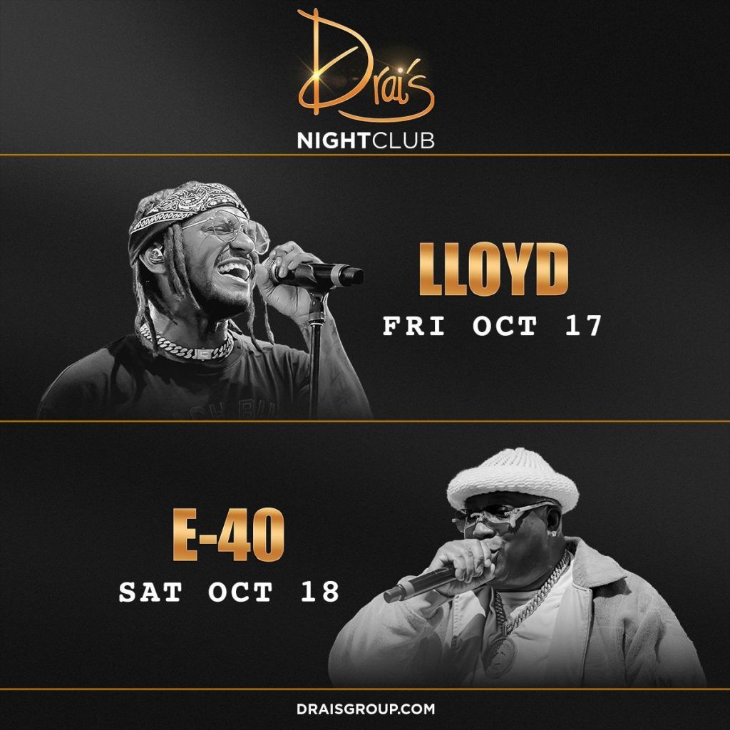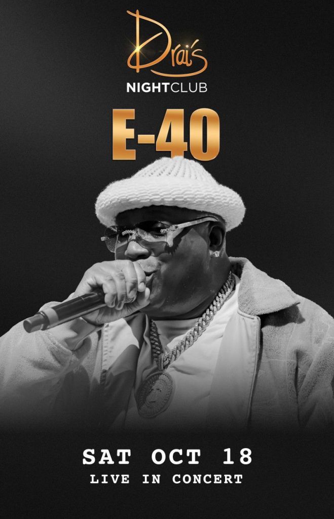 Live in concert is E-40 live performance at Drai’s Nightclub rooftop party. Real Hip hop plays here. For table service or Free entry Guest List text 702-929-4946
