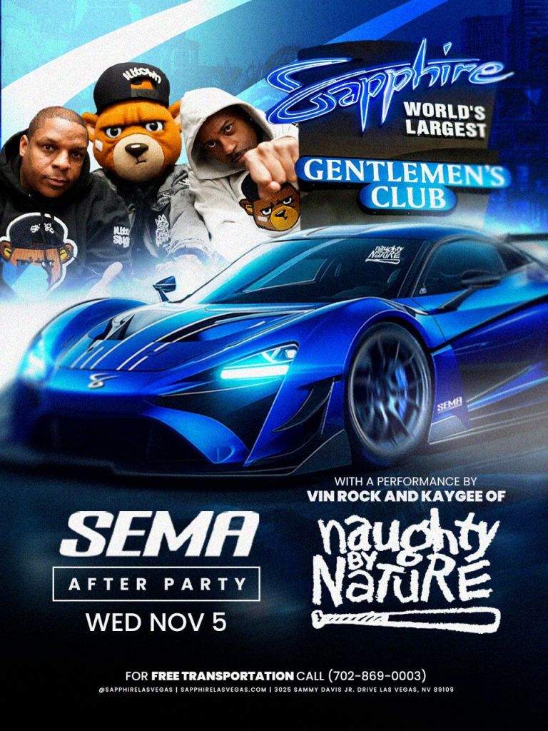 Tomorrow night at Sapphire Gentlemen’s club, Naughty by Nature will be performing for a SEMA after party event with a SEMA Car Meet in the Sapphire parking lot from 8pm-10pm. For Free Entry and Free Ride text 702-929-4946